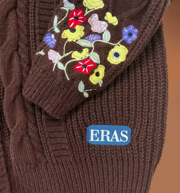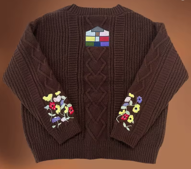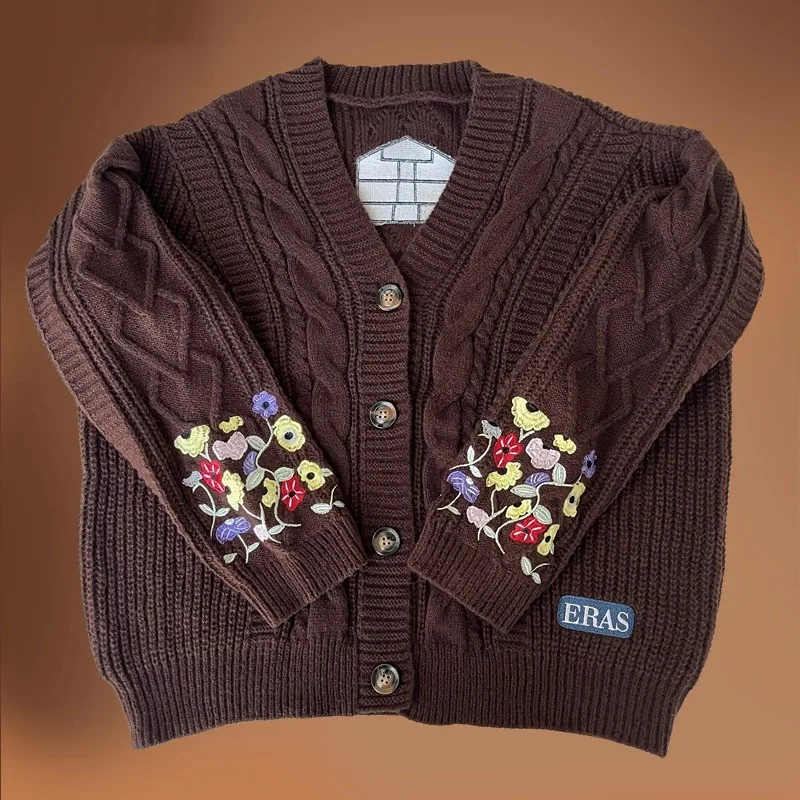 Made from a soft, warm fabric with a classic cable-knit texture, this cardigan features delicate floral embroidery on the front and sleeves, adding a gentle, handcrafted feel. The rich brown tone brings a warm, earthy look—perfect for autumn, winter, or any cozy season of the year. Its unique piano-inspired detailing offers a touch of musical nostalgia, making it a standout piece for creative souls and fans of artistic fashion.
