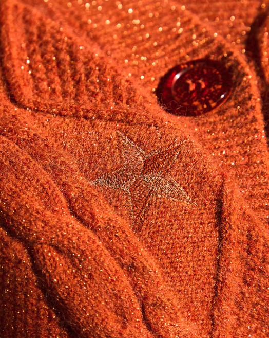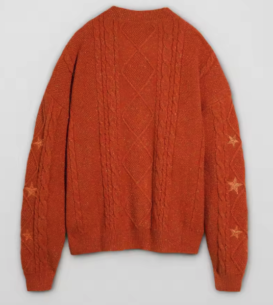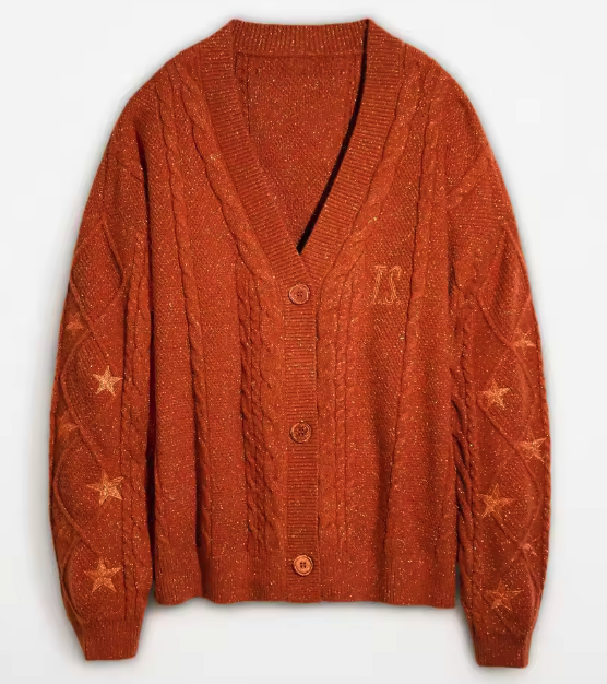 Made with a soft, warm fabric woven with subtle metallic threads, this cardigan catches the light beautifully—perfect for those who want an outfit that feels both comfortable and eye-catching. The rich burnt-orange tone adds warmth and sophistication, while the embroidered stars on the sleeves bring a playful yet elegant touch. A matching embroidered monogram on the chest completes the inspired design, giving it a collectible, fan-favourite feel.