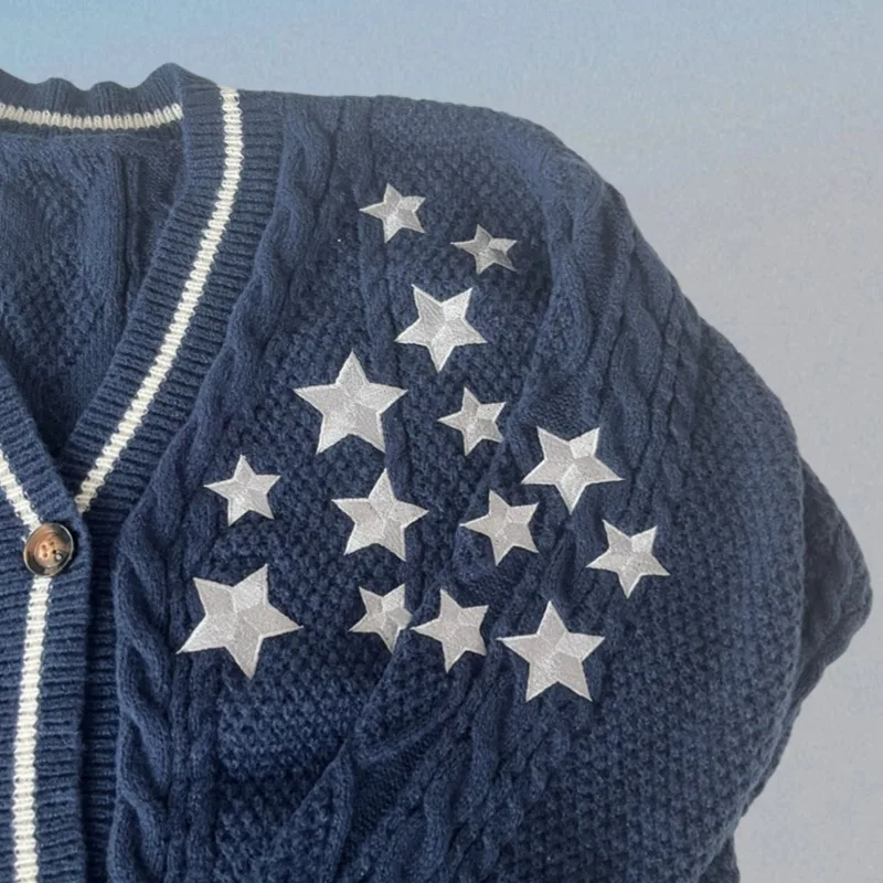 The Midnights cardigan is the ultimate piece for anyone who enjoys soft, celestial-inspired fashion. This design features a classic navy blue knit base, decorated with embroidered stars that give it a magical, night-sky look. Made with a comfortable blend of Polyester and Cotton, it offers warmth, softness, and durability—perfect for everyday wear or as a special statement piece.